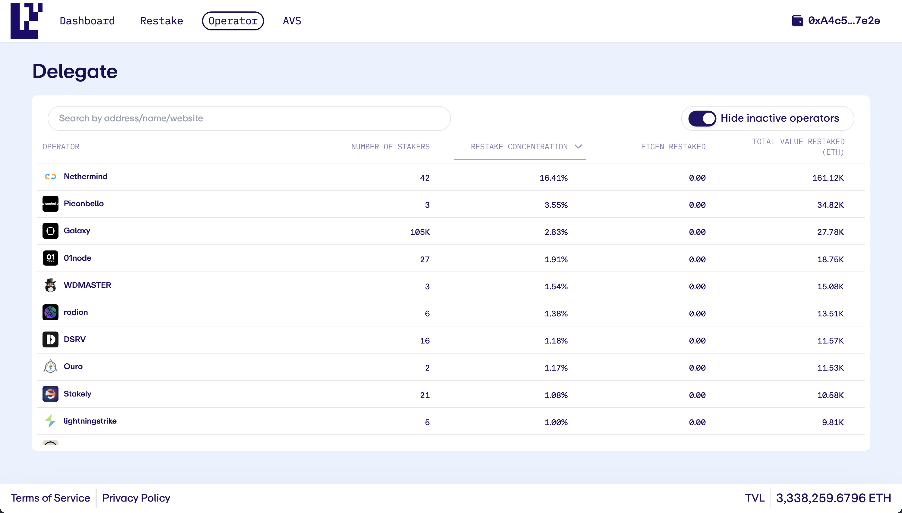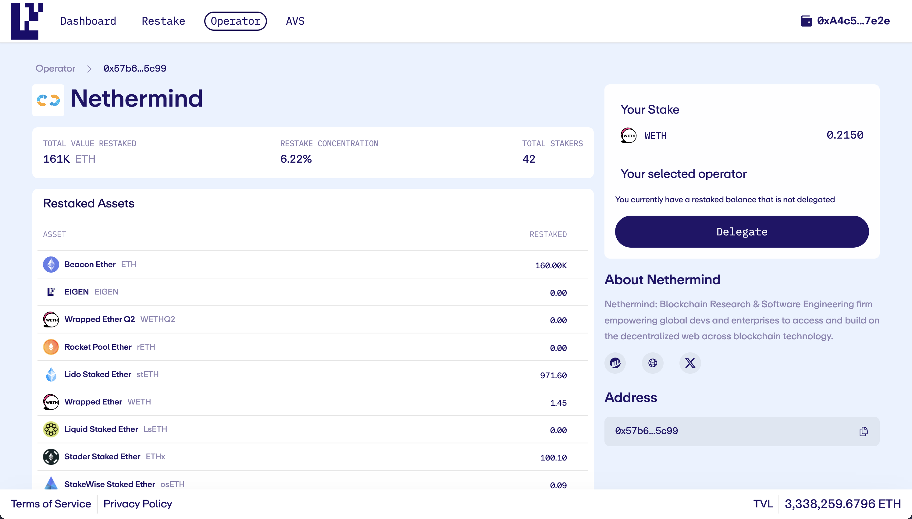 Step 3: Click Delegate to initiate a delegation of all your staked assets to that operator.